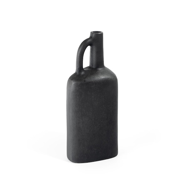 The 11-inch gray aluminum jug table vase adds a contemporary touch to your decor. Crafted from durable cast aluminum, this piece features a purposeful distressed metal finish that enhances its modern aesthetic. The chic dark gray color effortlessly complements a variety of interior styles, making it a versatile choice for any space. Ideal for showcasing fresh flowers or as a standalone statement piece, this table vase brings both elegance and character to your home. Its unique design ensures it stands out on tabletops, mantels, or shelves, creating an eye-catching focal point. Elevate your living environment with this stylish and functional vase, perfect for modern decor enthusiasts. 11-inch h x 5-inch w x 3-inch d.