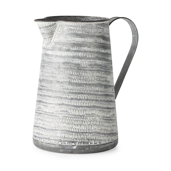 This 11-inch gray and white metal jug vase is the perfect addition to your modern space. With an abstract tribal or bohemian textured all over pattern in rustic gray and white tones, this vase effortlessly blends into many decor styles. Its almost 11-inch height makes it ideal for showcasing on a shelf, mantle, or tabletop centerpiece. 10.6-inch H x 7.1-inch W x 10-inch D