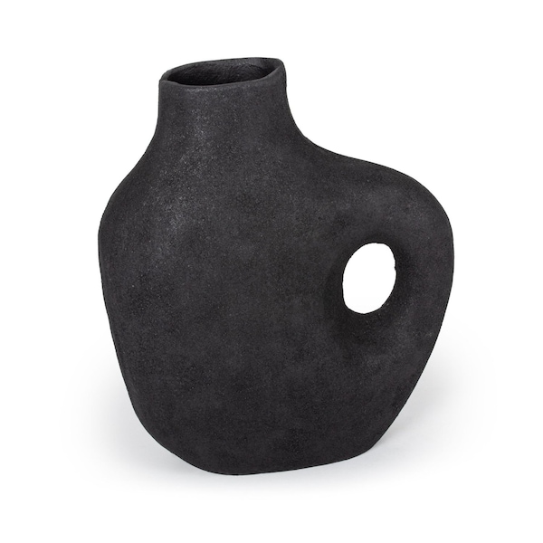 The 12-inch black aluminum table vase is a stunning addition to your home decor. Crafted from durable cast aluminum, this vase showcases a sleek black finish that effortlessly complements modern aesthetics. The purposeful distressing adds a unique character, making each piece one-of-a-kind. Perfect for displaying fresh flowers or as a standalone accent, its versatile design allows it to blend seamlessly with various interior styles. This table vase not only serves a decorative purpose but also enriches your living space with its contemporary charm. Elevate your home’s ambiance with this striking piece that brings a touch of sophistication to any room. 11.5-inch h x 10-inch w x 4-inch d.