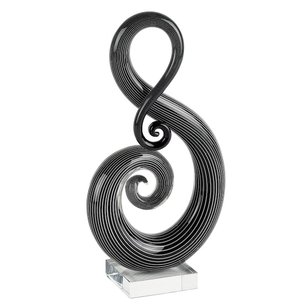 This 12-inch black and white Murano glass modern abstract tabletop sculpture will add a beautiful decorative accent to your decor. This black and white hued piece represents high quality, expertly made from high grade Murano glass. A perfect decorative addition for anyone who loves a stylish look and feel. 12-inch H x 3-inch W x 6.5-inch D