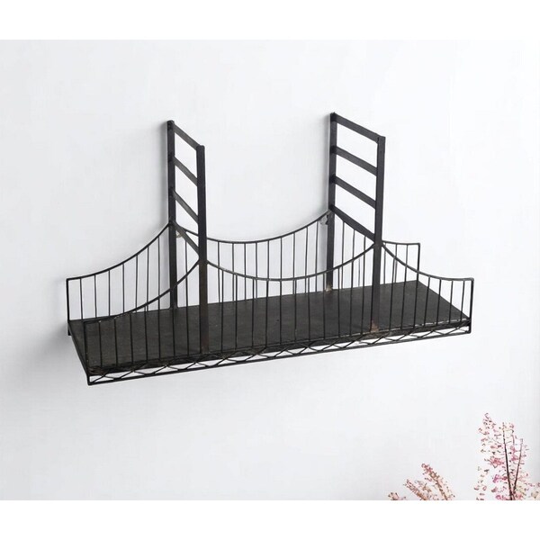 The 12-inch black metal wall mounted accent shelf is the perfect addition to your living room decor. Crafted from durable metal, this accent shelf showcases an industrial style that complements modern interiors. Its weathered matte black finish adds a touch of rustic charm. Inspired by California's Golden Gate Bridge, the unique shape of this accent shelf makes it practical for storage and display, but also a decorative accent unto itself. Ideal for displaying your favorite decorative items or plants, this shelf maximizes wall space while enhancing your home’s aesthetic. Embrace the beauty of functional design with this eye-catching shelf that brings both form and function to your home. 12-inch h x 22.05-inch w x 7.09-inch d.