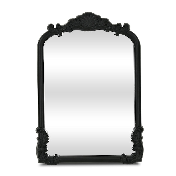This stylish 12-inch black solid wood scalloped freestanding framed makeup shaving tabletop mirror is the perfect solution for all your styling and makeup needs. Framed with solid wood with a pretty floral scalloped design. This mirror will bring practical application and fashionable design to your space. Produced with premium quality glass for a beautiful reflection, this mirror will provide an exceptional visual experience and be a great getting ready addition for your bedroom, bathroom, vanity, counter, or desk. 11.75-inch h x 8.25-inch w x 0.75-inch d.