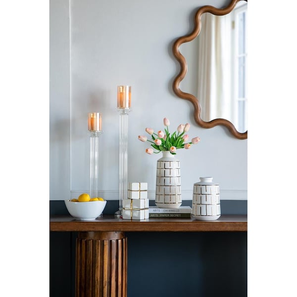 The 12-inch ivory and gold geometric round ceramic table vase is a stunning centerpiece that elevates any tabletop. This vertical cylindrical vase showcases a contemporary design, making it a perfect addition to modern decor. Hand-painted details add an artisanal touch, ensuring that each piece is unique and rich in character. Crafted from durable ceramic, it combines both functionality and style effortlessly. Its elegant ivory and gold color palette complements a variety of flowers or can be displayed alone for a minimalist statement. This table vase is ideal for enhancing your living space with a touch of sophistication and charm. 12-inch h x 5.5-inch w x 5.5-inch d.