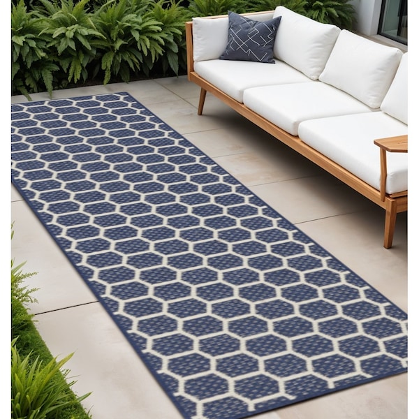12' Navy Blue And Ivory Geometric Indoor Outdoor Runner Rug