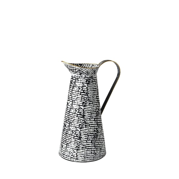 Enhance the elegance of your space with this 14-inch cylinder metal jug vase in a captivating black and white abstract design. Crafted with a rustic style, this vase features a unique coat/paint distressing that adds character to any room. The cylinder shape provides a modern touch, making it a versatile piece for displaying your favorite blooms or as a standalone decorative accent. The striking contrast between the black and white hues effortlessly complements any decor theme, adding a sophisticated flair to your home. Made of high-quality metal, this vase is a durable and stylish addition to your collection. 14.4-inch h x 7.1-inch w x 8.6-inch d.
