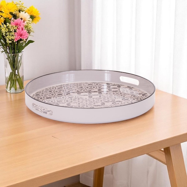 This 14-inch cream and gray geometric pad print round serving tray with handles is beautiful enough to be left out on the counter or shelf when not in use. Decorated with a pad print geometric design in the center, this piece is not only useful but a great decorative accent as well. Designed with cut out handles for easy transport and convenience. Food safe and versatile, this serving tray is sure to please. 1.75-inch h x 13.5-inch w x 13.5-inch d.
