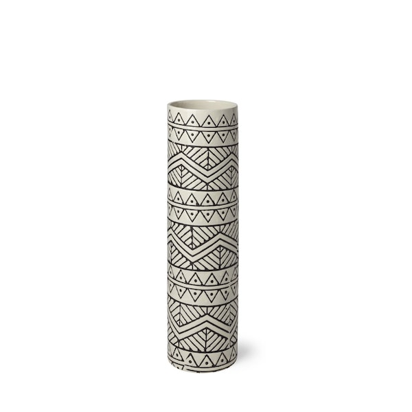 Elevate your space with this exquisite 14-inch cream geometric cylinder ceramic table vase, a stunning piece that effortlessly blends modern style with timeless elegance. The sleek cylinder shape and creamy hue of this ceramic vase make it a versatile addition to any room, adding a touch of sophistication to your decor. The geometric detailing on the surface adds a contemporary flair, making it a standout piece on any table or shelf. Crafted from high-quality ceramic, this vase exudes durability and quality craftsmanship, ensuring it remains a cherished accent in your home for years to come. Perfect for displaying fresh blooms or on its own as a decorative element, this table vase is a must-have for those who appreciate refined design. 14-inch h x 4-inch w x 4-inch d.