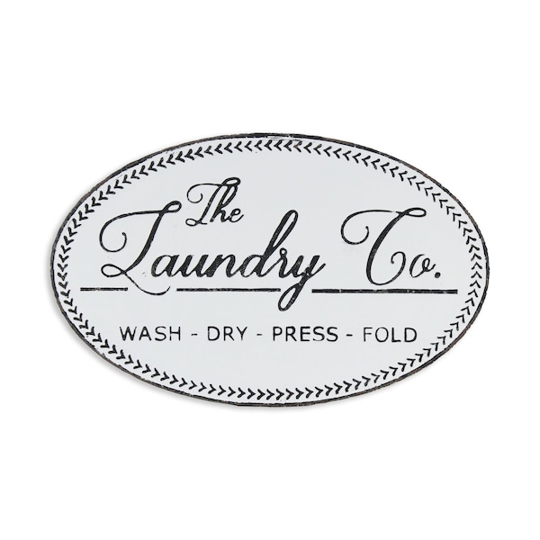 This 14-inch x 22-inch white and dark gray the laundry co metal oval wall decor will add a beautiful decorative accent to your walls. Decorate your laundry room in style with this handcrafted decor. Featuring a purposefully distressed and rustic finish, this metal laundry sign is emblazoned with the words "The laundry co wash press dry fold".14-inch h x 22-inch w x 1.25-inch d.