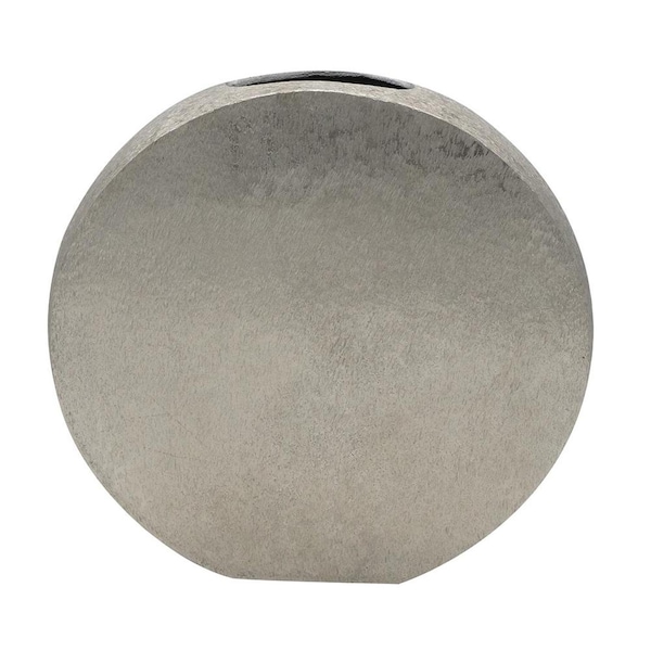 The 15-inch silver round disc aluminum table vase is an eye-catching centerpiece that enhances any table setting. Crafted from durable cast aluminum, this vase offers a textured roughhewn, modern look, making it a perfect addition to contemporary decor. Its slim profile disc shape adds a soft elegance, effortlessly complementing floral arrangements or standing alone as a sculptural statement piece. Ideal for both casual and formal occasions, this table vase will elevate your home with its stylish design. Use it in the dining room, living area, or office to create an inviting atmosphere that showcases your taste in decor. 14.5-inch h x 15-inch w x 2.8-inch d.