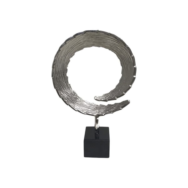 This modern tabletop sculpture, crafted from a blend of marble and aluminum in striking black and silver hues, exudes elegance and durability. Elevate your home decor effortlessly with this sleek piece that seamlessly complements any design aesthetic. The perfect addition to your space, whether displayed on its own or paired with other decorative elements, this sculpture is a timeless accent that will enhance the visual appeal of any room. 15.5-inch H x 10-inch W x 4-inch D