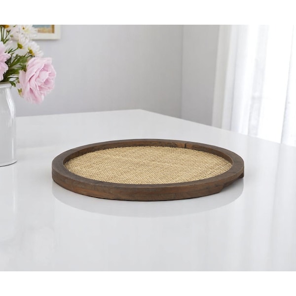 This 16-inch brown and natural solid wood and wicker handmade round serving tray is beautiful enough to be left out on the counter or shelf when not in use. Intended for decorative, or non-direct food contact use, it's perfect for serving or displaying a collection of candles, perfume, décor, and more. Hand-crafted with care, this versatile piece showcases a charming artisanal and earthy, coastal cottage style that enhances any decor. 15.75-inch h x 15.75-inch w x 0.98-inch d.