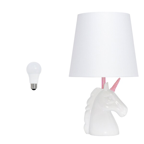 This 16-inch white and pink novelty table lamp led with white drum shade is a great way to add some brightness to any corner of your home. The lamp is made of sturdy resin and features a white and pink color. The white shade has a drum shape and is made from fabric. This standard table lamp is designed to provide general lighting to the area. The light that this lamp throws is soft and warm to elevate the look of most any space in your home. It is perfect for virtually any decor. 15.50-inch h x 9.00-inch w x 9.00-inch d.