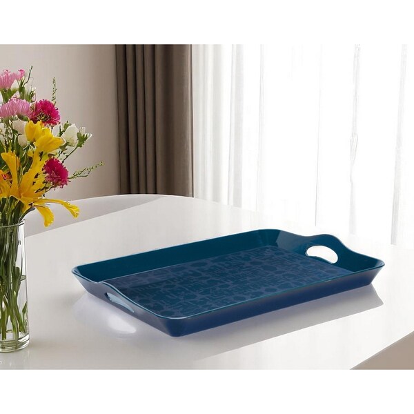 Freshen up your space with this convenient and good looking 17-inch blue geometric serving tray. Decorated with a modern abstract geometric pad print pattern, this tray is not only practical, but makes a great decorative accent as well. Designed with handles for easy transport and convenience. This serving tray has a food safe finish. 2.25-inch h x 17-inch w x 11.75-inch d.