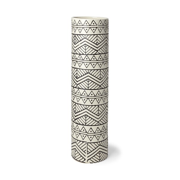 Add a unique design to any space in your home with this stunning 17-inch ceramic geometric cylinder vase. Its cool geometric pattern adds a touch of modern bohemian / tribal design sense to your space. Crafted from high-quality ceramic, this table vase showcases a sleek cylindrical shape and an ivory cream and charcoal black coloration that complements modern aesthetics perfectly. The size is versatile to place on the counter, table, console, or mantel, but will also work as a floor vase as well. Elevate your home styling with this beautiful ceramic vase, perfect for displaying fresh flowers or as a striking standalone piece. 17-inch H x 5-inch W x 5-inch D