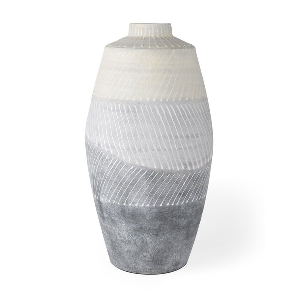 Ideal for displaying faux or dried flowers, it effortlessly elevates your home ambiance. This vase is crafted from high-quality ceramic in shades of cream and gray that features a unique geometric lines pattern, ensuring both durability and elegance in your decor. Display it on a coffee table, mantel, or shelf to create an inviting focal point. Its sturdy construction ensures longevity, while the sleek silhouette provides an effortlessly chic look to elevate your home decor game. 16.54-inch h x 8.27-inch w x 8.27-inch d.