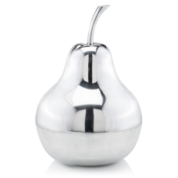 This decorative pear sculpture crafted from high grade buffed aluminum boasts a sleek silver color that adds a contemporary touch to any space. The modern style of this piece complements a variety of decor styles, making it a versatile and chic accent for your home. Its intricate design and expert craftsmanship make it a standout decorative item that exudes sophistication and style. Perfect for those seeking a unique and eye-catching addition to their living space, this sculpture is sure to impress with its high-quality construction and trendy aesthetic. 17-inch H x 12-inch W x 12-inch D