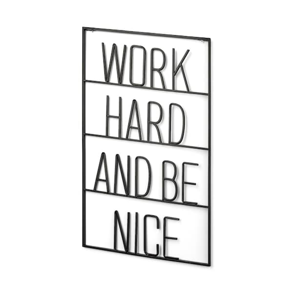 This 17-inch x 26-inch black work hard and be nice metal wall decor will add a beautiful decorative accent to your walls. Our words matter. Handmade with care, this piece brings some authenticity to your space. Instantly liven up your space with this text decor that brings sentiment, color, and dimension to your walls. This good looking decor will fill the empty space on your wall while adding a stylish and decorative touch. Utilize this opportunity to create a focal point in the room with this fabulous wall decor option. 17.3-inch h x 25.99-inch w x 0.52-inch d.