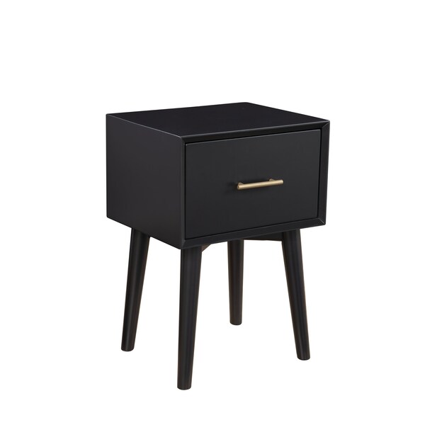 Optimize your space and add some charm to your room with the 18" black mid century mod wood end table with drawer. Made of a mix of solid and manufactured woods/veneers, the black coloration throughout gives this piece an updated and refreshing look. Includes a single, felt lined, easy pull out drawer for handy storage of life's little essentials. An ideal location for placing your snacks and drinks, and a place to keep your lamp, frames, or other accessories. Gold drawer pull offsets the piece and gives it a glam look. 26.5" H x 18" W x 15" D