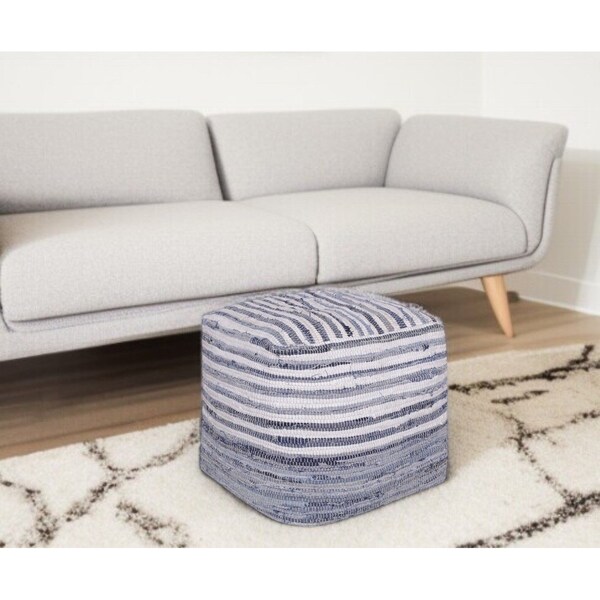 Optimize your space and add some charm to your room with the 18-inch blue cotton cube striped pouf ottoman. Add chic style to your space with this fun pouf that not only looks cool but can be a great foot rest or extra seat when needed. Expertly upholstered with padding and soft cotton in a striped pattern, this ottoman is as comfortable as it is good looking. Ottomans are multi-functional additions to your space that add fashion and practical value. 18-inch H x 18-inch W x 18-inch D