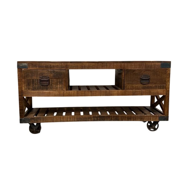 18" Brown and Black Solid Wood Distressed Wheel Console Table With Shelves And Drawers