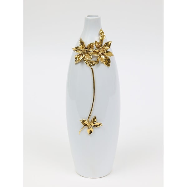 The 18-inch gold floral oval ceramic table vase with sculptural details is a stunning centerpiece that elevates any room's decor. Its elegant oval shape offers a unique silhouette, making it perfect for showcasing your favorite blooms. Crafted from high-quality ceramic, this vase combines durability with style, ensuring it remains a timeless accent piece. The modern design seamlessly integrates with various interior aesthetics, adding a sophisticated touch to your space. Adorned with intricate sculptural details, this vase serves not just as a container but as an artistic statement. Place it on a dining table, console, or any surface where you want to bring a touch of elegance and charm to your home decor. 18-inch h x 5-inch w x 5-inch d.