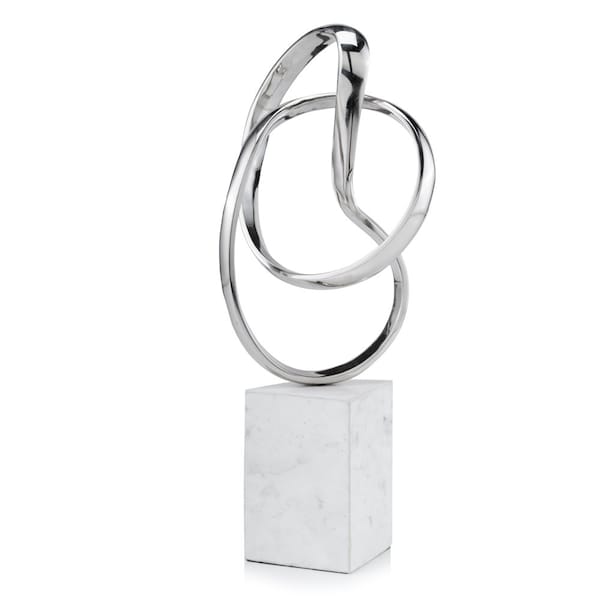 The 18-inch silver and white marble and aluminum sculpture is the perfect decorative accessory for your home. This modern tabletop sculpture is made of high quality marble and aluminum and will look great in most any space. The rectangular base gives way to two intertwined loops of buffed shiny aluminum in a silver finish that is unique and contemporary. 17.5-inch H x 5.5-inch W x 7.5-inch D