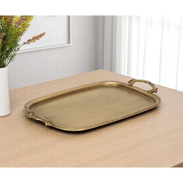 Freshen up your space with this convenient and good looking 19-inch antiqued gold cast iron handmade vanity tray. Features sculptural floral handles for quick and easy transportation, this handcrafted tray features slight distressing and an antiqued finish for a rustic touch. Intended for decorative, non-food use only, it's perfect for serving or displaying a collection of candles, perfume, décor, and more. 1.125-inch h x 18.75-inch w x 11.125-inch d.