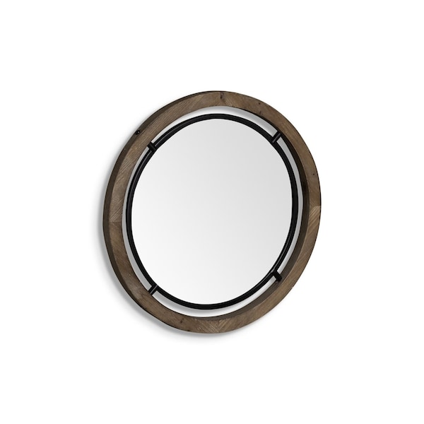 If you want to add some brightness to your living space, the 19-inch black and brown metal and solid wood round geometric framed accent mirror is perfect for you. Framed with metal and solid wood, this mirror will bring practical application and fashionable design to your space, adding some country flair to your decor. Features quality craftsmanship in every facet that ensures durability and long-lasting wear. Produced with premium quality glass for a beautiful reflection, this mirror will provide an exceptional visual experience. 19.25-inch h x 19.25-inch w x 1.25-inch d.