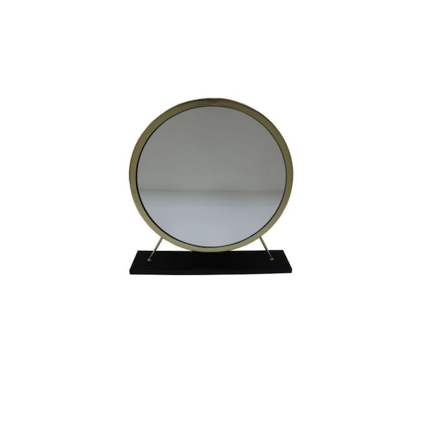 The 19-inch brass round metal framed freestanding mirror is a handsome desktop mirror for easy and quick styling. Framed with metal, this mirror will bring practical application and fashionable design to your space, adding some modern flair to your decor. Features quality craftsmanship in every facet that ensures durability and long-lasting wear. This mirror will be a great addition to your bedroom, bathroom or desk. Produced with premium quality glass for a beautiful reflection, this mirror will provide an exceptional visual experience. 19-inch h x 19-inch w x 4-inch d.