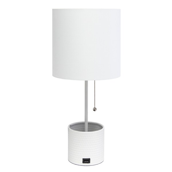 This 19-inch white metal usb table lamp with white drum shade is the perfect combination of design and function. The base of this lamp is made of metal finished in a white tone. The white shade has a drum shape and is made from fabric. This standard table lamp is designed to provide general lighting to the area. The light that this lamp throws is soft and warm to elevate the look of most any space in your home. It is perfect for virtually any decor. 18.50-inch h x 8.00-inch w x 8.00-inch d.