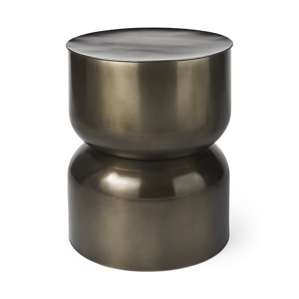 Distinctive in style the 20-inch antiqued gold iron round drum end table radiates a versatile charm. This table is made from iron with a brushed antiqued gold finish throughout the base and top. The modern drum shape is cinched in the middle to resemble an hourglass. Side tables are a great way to flank your sofa, use as an accent next to your favorite chair, or can even be used bedside. You can match it with other pieces to get the ideal look for your place. 20.00-inch h x 17.00-inch w x 17.00-inch d.
