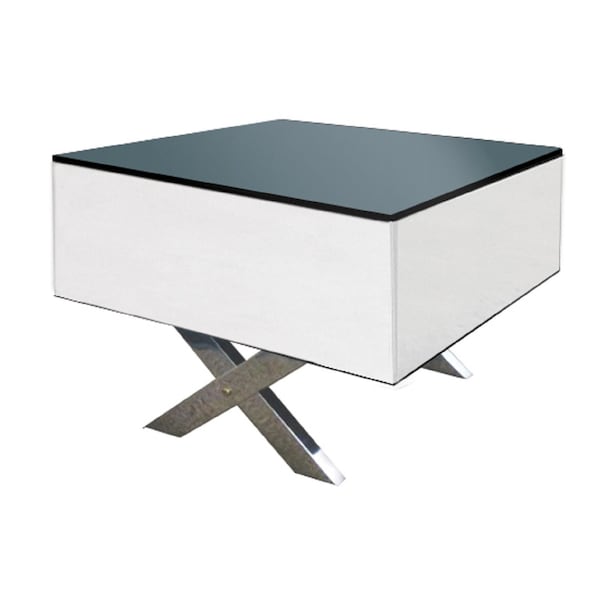 Optimize your space and add some charm to your room with the 20-inch black and white mirrored glass square cross legs end table.. The top of this glass table is black, while the base is a nice compliment in white and the feet are in a silver chrome. Reflective pieces of dark and smoky mirrored glass give this table a glamorous and unique look. A great accent on either side of the sofa or bed, this adorable end or side table is just what you need. You can also use it as an entryway table to hold your keys. 20-inch h x 24-inch w x 24-inch d.
