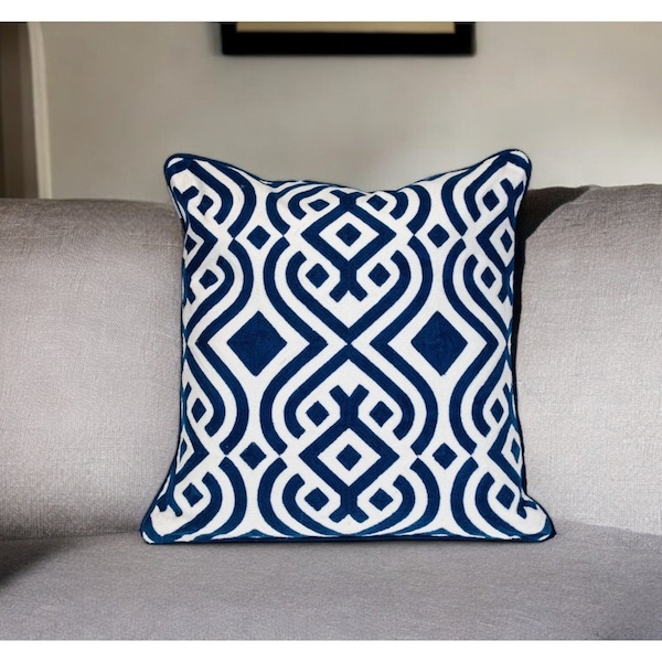 20" Blue and White Geometric Cotton Throw Pillow