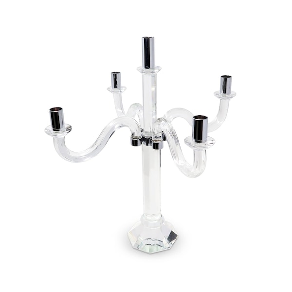 This 20-inch silver and clear crystal tabletop candelabra candle holder is perfect for creating an elegant atmosphere on your tabletop or mantel. This candleholder is the perfect illuminating design to accent your space in style. A striking centerpiece, this chic candelabra features a contemporary shape and silver tips Crafted from elegant crystal, this modern candle holder enhances the ambiance with contemporary style and silver tips. 20-inch h x 13-inch w x 13-inch d.