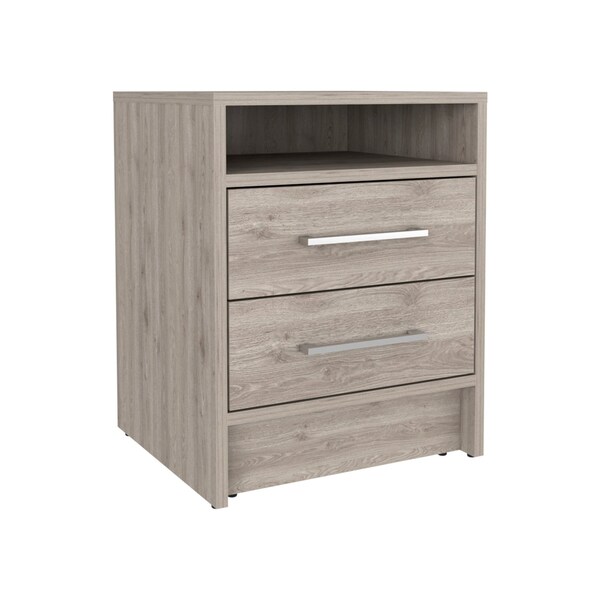 Give your room the look and feel of 5-star accommodations with this 20-inch gray wood two drawer nightstand. Robust in design, the bed side table has been expertly crafted from manufactured wood. Includes 2 drawers to give you multiple storage options to keep clutter at bay. An easy-access shelf gives you additional storage and display space. The unsung hero of the bedroom, this nightstand is perfect for keeping a glass of water, lamp, alarm clock, jewelry, and more, close by and easily accessible. Versatile in use this nightstand would also work as a great end table in the living room, hallway, or office. 19.9-inch h x 15.7-inch w x 14.7-inch d.