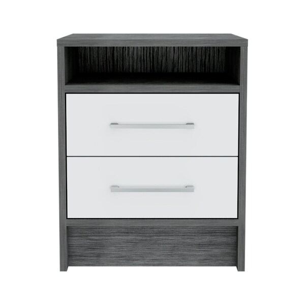 Our 20-inch gray wood two drawer nightstand will compliment your bed beautifully. Made of high quality manufactured wood that is built to last. The piece has 2 drawers to store your bedtime essentials close to you as you rest. An easy-access shelf gives you additional storage and display space. The unsung hero of the bedroom, this nightstand is perfect for keeping a glass of water, lamp, alarm clock, jewelry, and more, close by and easily accessible. Versatile in use this nightstand would also work as a great end table in the living room, hallway, or office. 19.9-inch h x 15.7-inch w x 14.7-inch d.