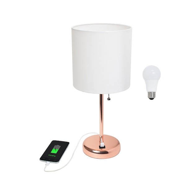With this 20-inch rose gold metal usb table lamp led with white drum shade you can bring in design to any space along with adding some ambient lighting. The base of this lamp is made of rose gold metal. The white shade has a drum shape and is made of fabric, which makes it a perfect choice. This standard table lamp is designed to provide general lighting to the area. High quality design makes this a great lamp for not only lighting, but accenting a room with style. Bring some lite and good vibes into your space with this updated and stylishly designed lamp. 19.50-inch h x 8.50-inch w x 8.50-inch d.