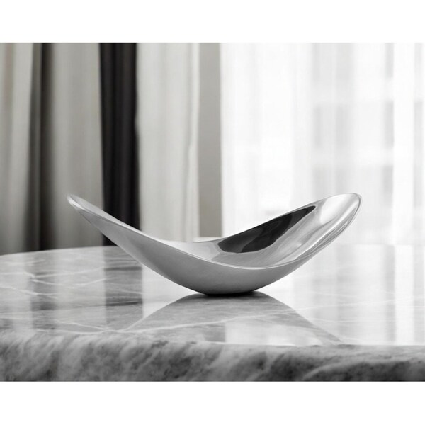 Enhance your table decor with this stunning 7-inch silver aluminum contemporary scoop decorative bowl. Crafted as a centerpiece bowl, its abstract shape adds a touch of modern elegance to any setting. The sleek silver finish complements a variety of decor styles, making it a versatile piece for your home. Ideal as a decorative centerpiece or focal point on your dining table, coffee or console table, bookshelf, desk, or mantle. Its unique slightly twisted and scooped contemporary design will surely impress your guests at any gathering. Add a sophisticated touch with this modern-inspired bowl that exudes charm and sophistication. 6.5-inch h x 19.8-inch w x 7.3-inch d