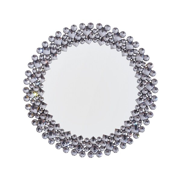 Beautify your space with this 20-inch silver round faux crystal bling framed accent mirror. Framed with geometric and sparkly pieces of faux crystal bling, this mirror will bring practical application and fashionable design to your space, adding some glam flair to your decor. Features quality craftsmanship in every facet that ensures durability and long-lasting wear. Add this exceptional quality mirror to your space for a beautiful reflection and a bit of elevated style. 20-inch h x 20-inch w x 3-inch d.