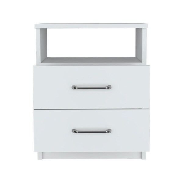 Give your room the look and feel of 5-star accommodations with this 20-inch white wood two drawer nightstand. Made of high quality manufactured wood that is built to last. The piece has 2 drawers to store your bedtime essentials close to you as you rest. An easy-access shelf gives you additional storage and display space. The unsung hero of the bedroom, this nightstand is perfect for keeping a glass of water, lamp, alarm clock, jewelry, and more, close by and easily accessible. Nightstands are obviously great beside the bed but can be used just as easily to help battle clutter in your living room, hallway, office, or dining room. 19.9-inch h x 16.02-inch w x 12.9-inch d.