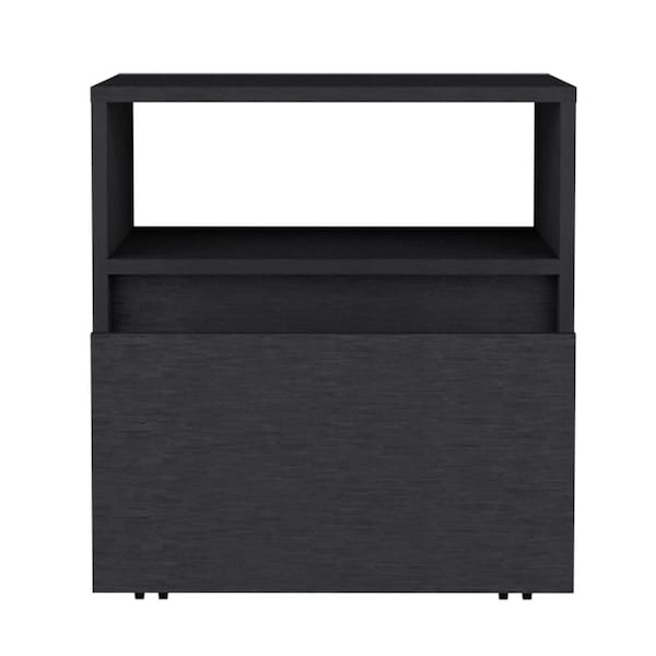 Give your room the look and feel of 5-star accommodations with this 21-inch black wood one drawer nightstand. Robust in design, the bed side table has been expertly crafted from manufactured wood. Includes a drawer to help keep your essentials close by and hidden. An easy-access shelf gives you additional storage and display space. The unsung hero of the bedroom, this nightstand is perfect for keeping a glass of water, lamp, alarm clock, jewelry, and more, close by and easily accessible. Look no further than this nightstand to accommodate all your needs and upgrade the style of your bedroom. 20.5-inch h x 15.7-inch w x 15.7-inch d.