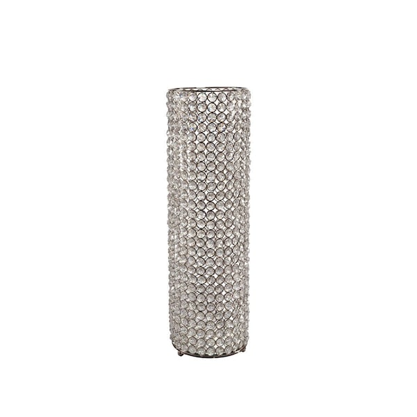 The 21-inch clear and silver faux crystal and metal table vase is a stunning addition to any decor. Crafted in a sleek cylindrical shape, this vase elegantly showcases your favorite floral arrangements. Made from high-quality faux crystal with silver accents, it offers a luxurious finish that enhances its modern style. The vase is adorned with beautiful crystals, adding an extra touch of sophistication to your interior space. Perfect for tabletops or as a centerpiece, it seamlessly blends with various design aesthetics, making it a versatile choice for home decoration. Elevate your living area with this eye-catching piece that combines contemporary flair with timeless elegance. 20.5-inch h x 6.25-inch w x 6.25-inch d.