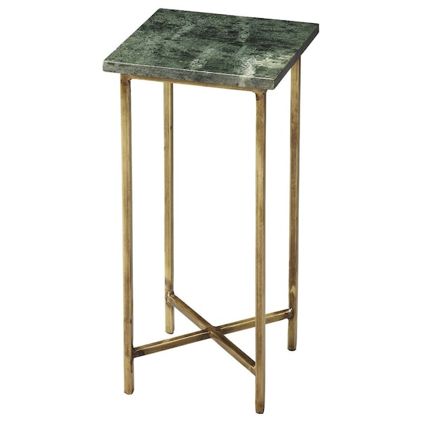 Show off your exquisite taste with this 21-inch green and gold marble square end table. The base of this table is made from iron in an open geometric gold color that is a nice contrast to the small square green marble tabletop. A great accent on either side of the sofa or next to your favorite chair, this table features a 9.5-inch tabletop surface that is a great place to hold your drinks, snacks, or small accents. You can also use it as an entryway table to hold your keys. 20.5-inch h x 9.5-inch w x 9.5-inch d.