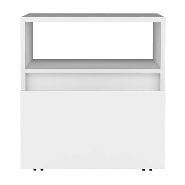 Give your room the look and feel of 5-star accommodations with this 21-inch white wood one drawer nightstand. Robust in design, the bed side table has been expertly crafted from manufactured wood. Includes a drawer to help keep your essentials close by and hidden. An easy-access shelf gives you additional storage and display space. The unsung hero of the bedroom, this nightstand is perfect for keeping a glass of water, lamp, alarm clock, jewelry, and more, close by and easily accessible. Versatile in use this nightstand would also work as a great end table in the living room, hallway, or office. 20.5-inch h x 15.7-inch w x 15.7-inch d.