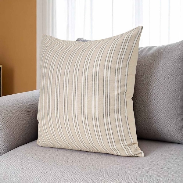 Bring a bit of fashion and zip to your space with this eye-catching and comfy 22-inch beige and black striped cotton blend throw pillow cover with texture. This beige and black hued, accent pillow cover, represents quality construction, expertly made from durable cotton blend that is not only long lasting but soft to the touch as well. Decorative pillow covers are a great way to change up the look and feel of your space easily and quickly. Combine with your own fill or insert to add decoration and dimension to your favorite chair, accent your sofa, or to use as part of your bed ensemble. 22.00-inch h x 22.00-inch w x 0.50-inch d.