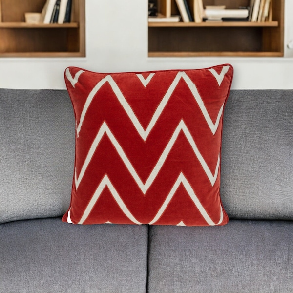 22" Beige and Red Zigzag Cotton Throw Pillow with Embroidery and Applique