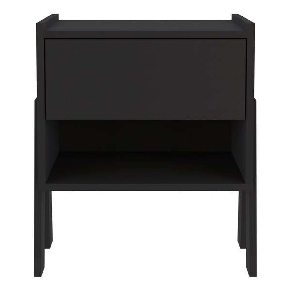 Good looking design and practical styling meet to form this 22-inch black wood one drawer nightstand. Sturdy and durable construction from manufactured wood ensures this trusty bedside table is built to last. Includes a drawer to help keep your essentials close by and hidden. An easy-access shelf gives you additional storage and display space. The unsung hero of the bedroom, this nightstand is perfect for keeping a glass of water, lamp, alarm clock, jewelry, and more, close by and easily accessible. Versatile in use this nightstand would also work as a great end table in the living room, hallway, or office. 21.8-inch h x 18.8-inch w x 15.7-inch d.