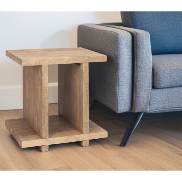 Show off your exquisite taste with this 22-inch brown solid wood sled end table with shelf. This table is made from solid wood in a light brown color throughout the base and top. Help to keep your space organized with the included single shelf. Side tables are a great way to flank your sofa, use as an accent next to your favorite chair, or can even be used bedside. This versatile table is a great accent for most any room. 22-inch h x 18-inch w x 22-inch d.