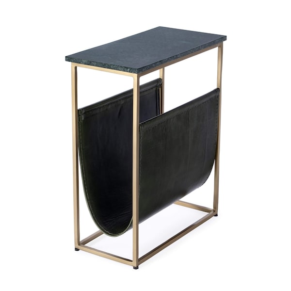 Show off your exquisite taste with this 22-inch green and gold marble and iron frame end table with magazine holder. The gold coloration of the high quality iron base marries nicely with the green marble top and features a rustic aged leather hanging magazine holder pouch. A great accent on either side of the sofa or bed, this adorable end or side table is just what you need. You can also use it as an entryway table to hold your keys. 22.00-inch h x 17.50-inch w x 9.00-inch d.