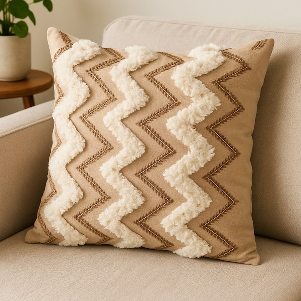 22" Tan And White Zigzag Linen Throw Pillow Cover with Embroidery